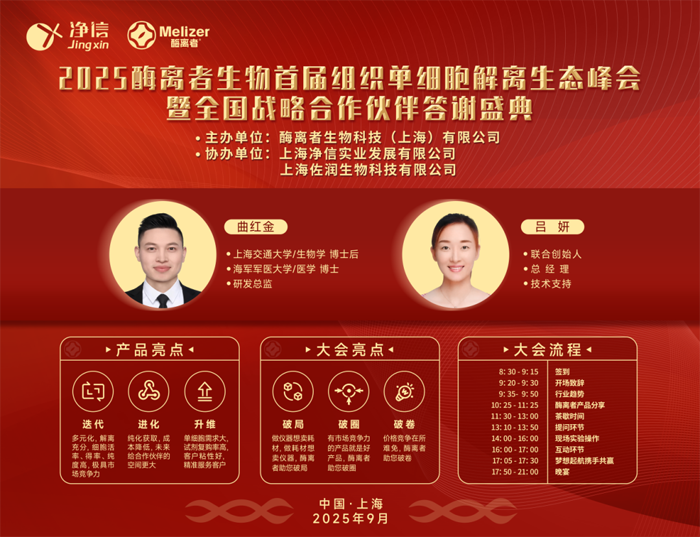 2025年9月15日,深耕單細胞解離領域的酶離者品牌,在品牌總部研發中心盛大召開2025國內代理商大會。來自北京、上海、廣州、深圳、成都、西安等28個省市的代理商伙伴齊聚一堂,圍繞“技術賦能、市場協同、共贏增長”核心主題,共同學習酶離者全系列產品應用,探討國內市場的開拓策略,凝聚合作共識,攜手開啟單細胞解離技術推廣的新征程。