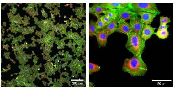 免疫染色Rat1細胞在μ-Slide 1孔中的寬場熒光顯微鏡。F-肌動蛋白細胞骨架用鬼筆肽(綠色)染色。用α-微管蛋白抗體染色微管(紅色)。用DAPI(藍色)觀察細胞核。 圖像是在尼康顯微鏡上用10倍(左)和60倍(右)物鏡拍攝的,后者是浸油的。